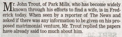 Ha! This guy has some gumption! Seriously… after 3 blurbs I wanted to know “Who IS this guy? Who is JOHN TROUT? Why in the world was he looking for a wife in the paper?” And “Really, this is 1912??” I was consumed with wanting to know more about him! Who knew the Frederick News Post was the original e-harmony.com?
